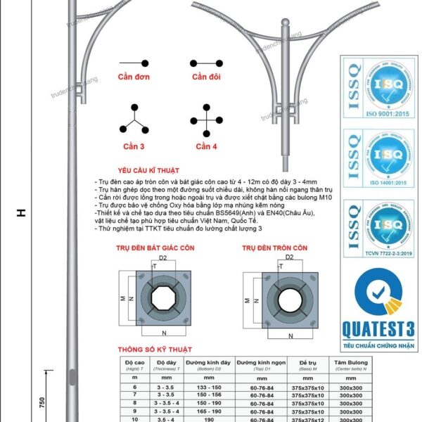 Chọn nhà sản xuất cung cấp trụ đèn cao áp chiếu sáng đường phố cao 8m, 9m, 10m, 11m, 12m cần đơn, cần đôi tại các công trình: