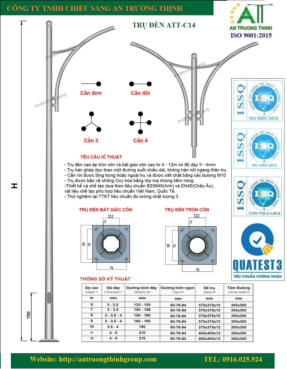 Cột Đèn, Trụ Đèn Cao Áp Chiếu Sáng 3m, 4m, 5m, 6m, 7m, 8m, 9m, 10m ATT-C14
