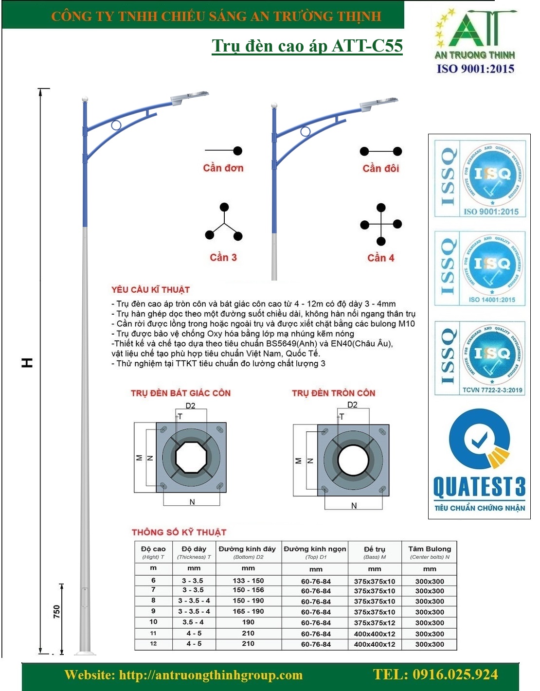 Trụ Đèn Cao Áp Côn Tròn, Bát Giác 4m, 5m, 6m, 7m, 8m, 9m, 10m ATT-C55