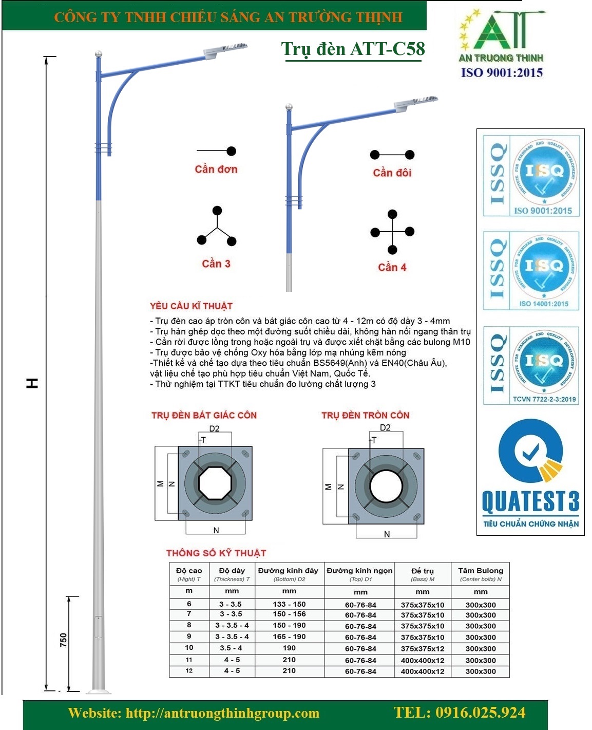 Thông số kỹ thuật trụ đèn cao áp, cột đèn chiếu sáng ngoài trời cao 4m, 5m, 6m, 7m, 8m, 9m, 10m: